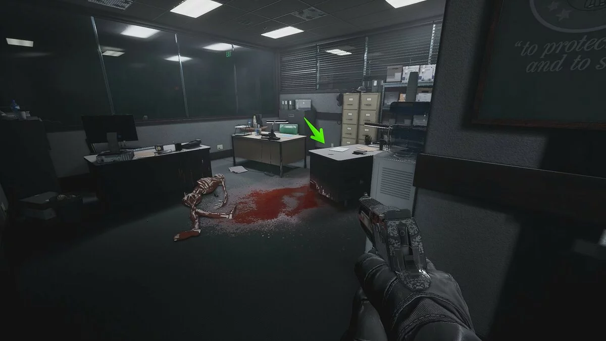 Взаимодействуйте с рацией, изучите документ с кодом (1278) и заберите ключ от хранилища. Как только вы войдёте в офис, на протагониста снова нападёт сильный вампир.