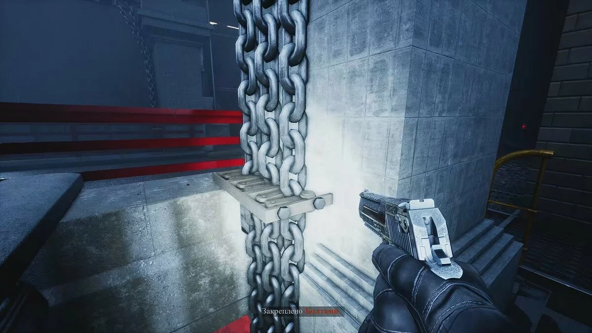 Вернитесь обратно, поставьте аккумулятор и залейте топливо. Опустите рычаг на пульте управления, чтобы увидеть, что цепи не дают опустить мост. Пройдите к цепям и примените на них гаечный ключ.