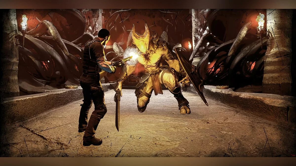 После кат-сцены придётся разобраться с финальным боссом. Сделать это проще, чем кажется на первый взгляд. На груди врага есть светящийся камень — стреляйте по нему до тех пор, пока энергетические барьеры с камней вдоль прохода не исчезнут. Пока барьер отсутствует, уничтожайте камни красного цвета. Именно из них враг черпает свою силу.