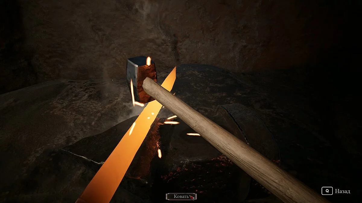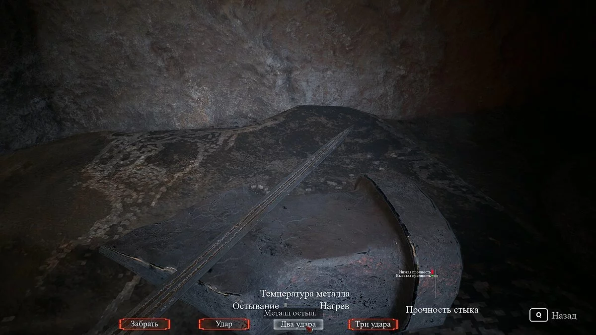 Вернитесь в кузницу и выберите две половины меча. Нагрейте их и приступайте к ковке. Выберите: