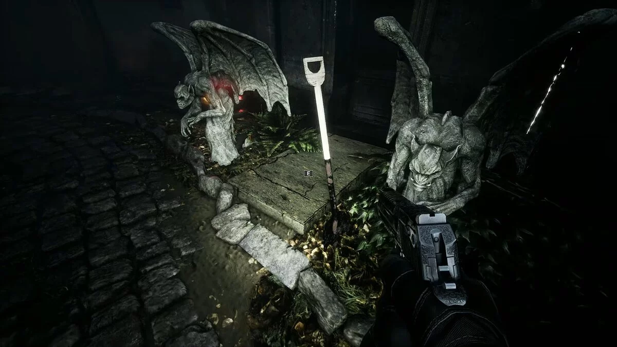 Подобрав лопату, бегите в дальнюю часть кладбища и отыщите могилу со статуей ангела. Примените лопату на ту могилу, куда смотрит статуя. Так вы получите ключ двери склепа.