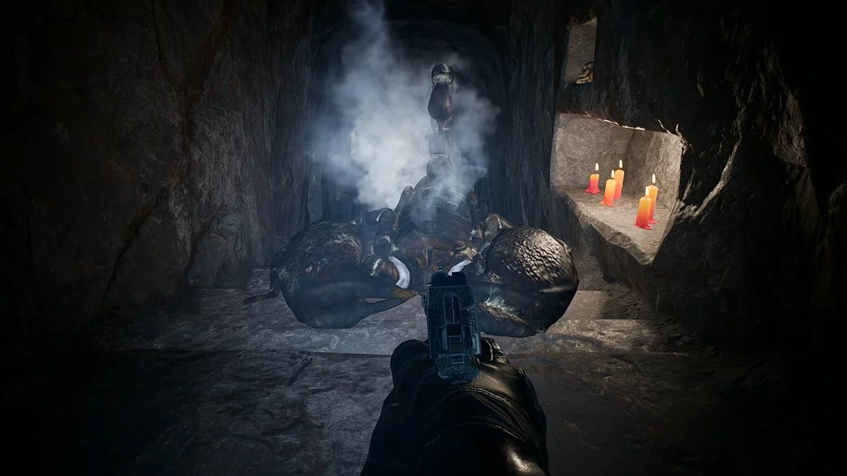 Слева будут два мертвяка — игнорируйте их. Бегите вперёд и откройте единственную дверь. За ней покажутся несколько упырей и огромная змея. Можете отойти подальше и выстрелить из гранатомёта.