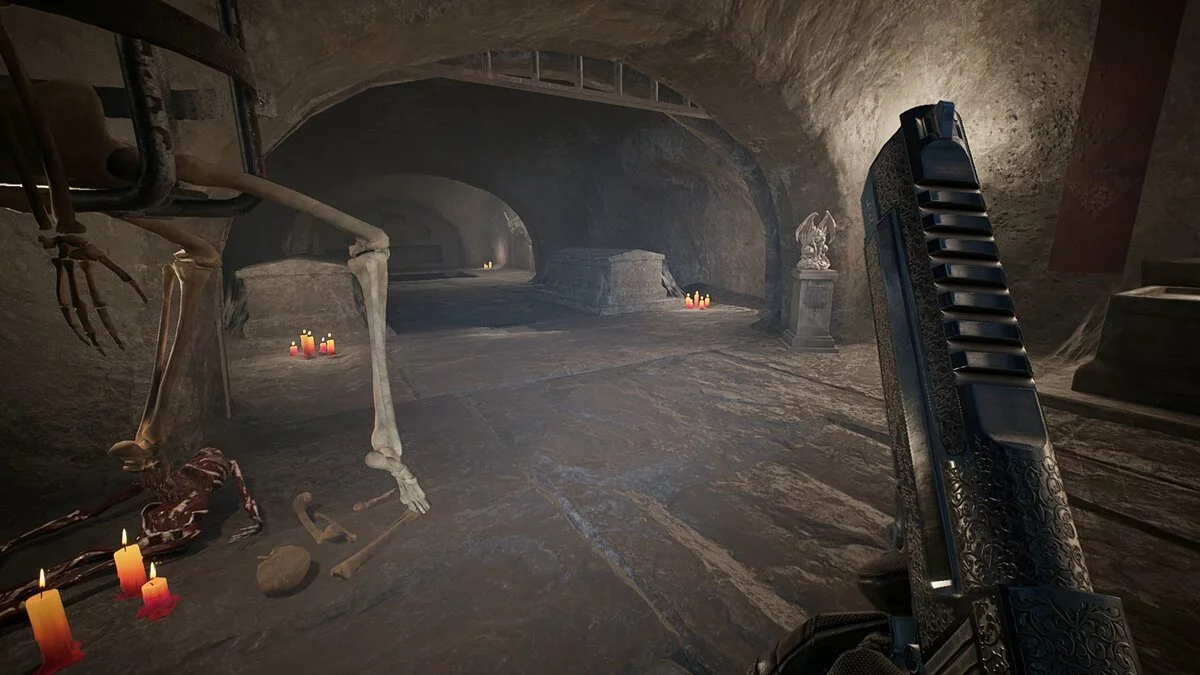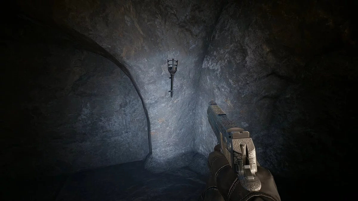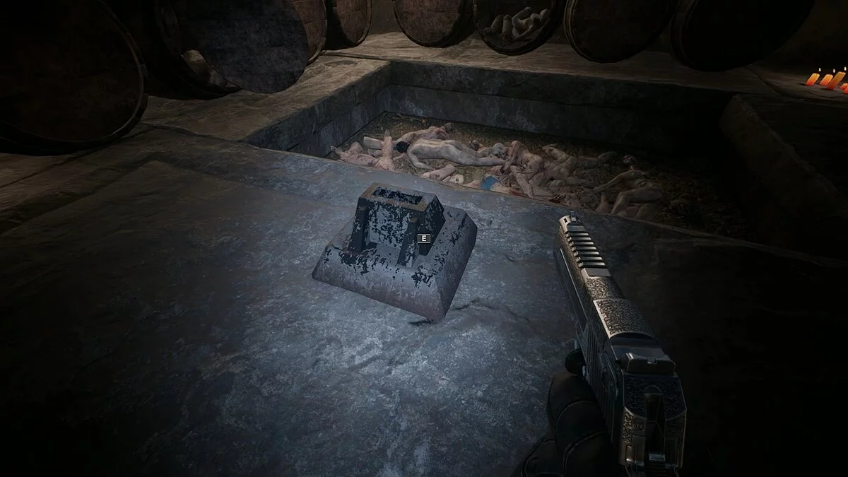 На нижнем уровне подземелья вы встретитесь с несколькими упырями. Бегите всё время вперёд и осмотрите большую комнату. Здесь можно решить головоломку. Нам не удалось разобраться, как её пройти, поэтому можете использовать один череп пропуска (единственный за игру), чтобы получить ключ. У трупа в центре комнаты также можно взять патроны и аптечки.