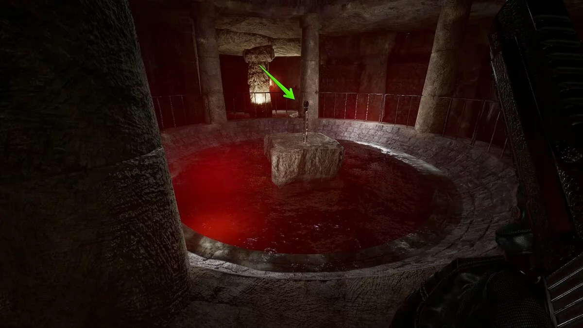 Теперь покиньте комнату и вернитесь к выходу из склепа. Здесь есть бассейн с трупами. Примените на него ритуальный рычаг, чтобы пробудить древних вампиров, а также открыть проход ко второй половине меча. Не забудьте второй раз нагреть меч и закалить его в ванной с кровью.