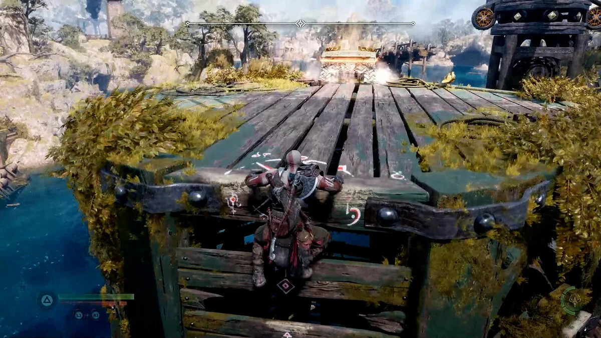 Когда вы доберетесь до пляжа, посмотрите направо, чтобы увидеть высокую платформу, где находится легендарный сундук. Вы можете добраться до него, уничтожив противников и забравшись наверх. Бросьте топор на вращающийся рычаг, чтобы открыть ворота на высокую деревянную платформу.