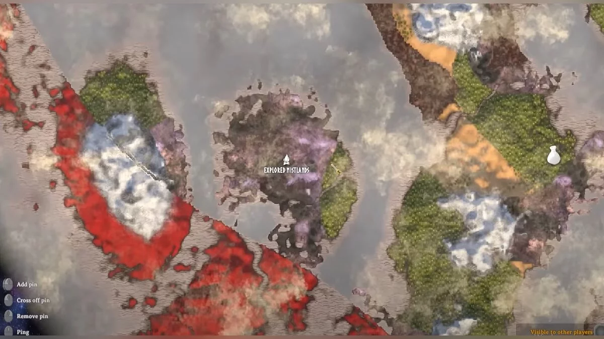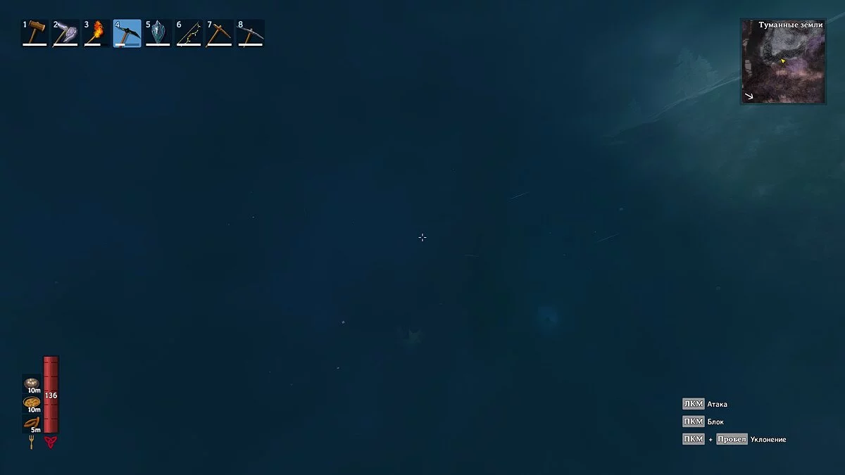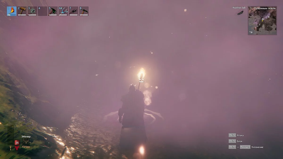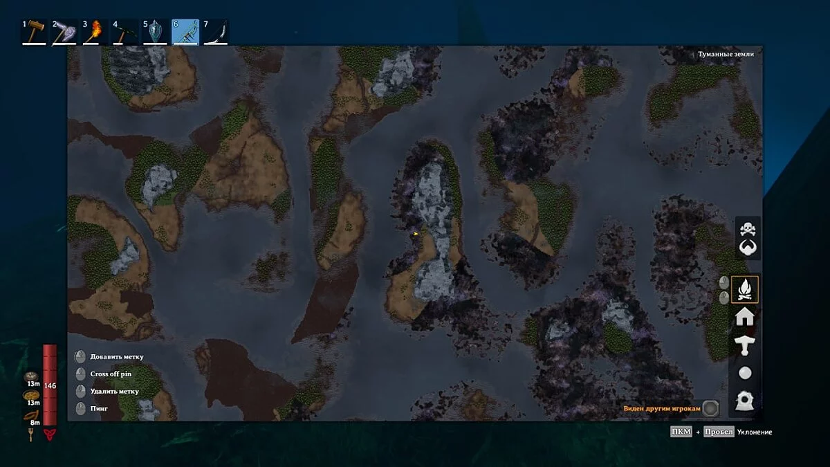 Густой туман — ещё одна новая механика в Valheim. Большое скопление тумана обозначено на карте фиолетовым цветом. Из-за него ваш герой будет практически ослеплён, и даже обычный факел и ручной фонарь не помогут осветить путь.