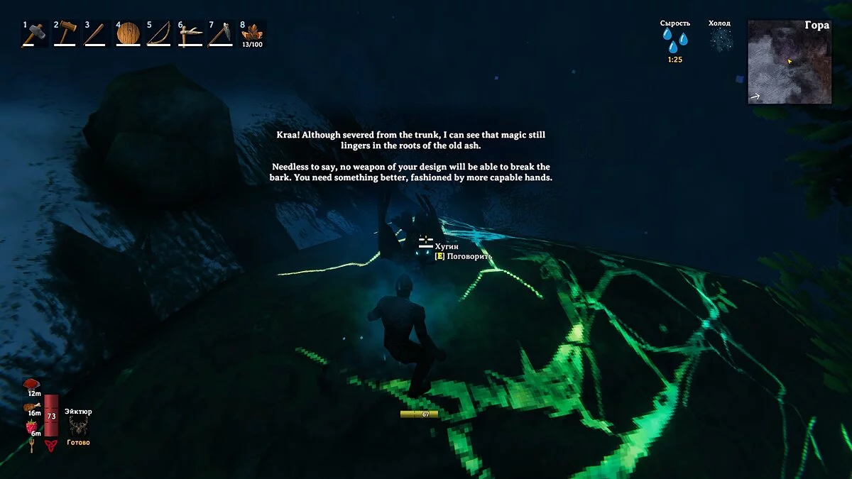 На территории Туманных земель вы будете сталкиваться с корнями магического дерева. Когда вы впервые найдёте подобный корень, то сможете побеседовать с Хугином. Он расскажет, что в корнях растения ощущается магия, которую можно добыть.