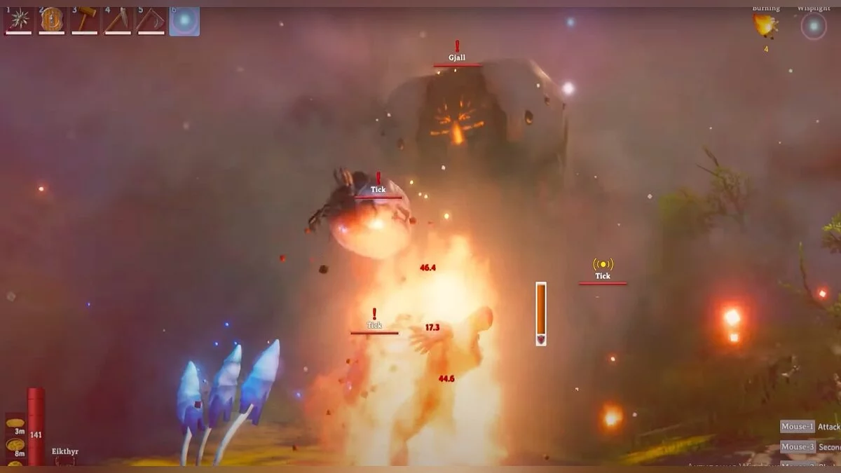 Гьяллы (Gjall). Гигантские огнедышащие насекомые. Убивайте их на расстоянии при помощи лука или магии. При этом нужно постараться не попасть под дальние атаки монстра. Помимо прямых атак, Гьяллы могут выпускать множество клещей.
