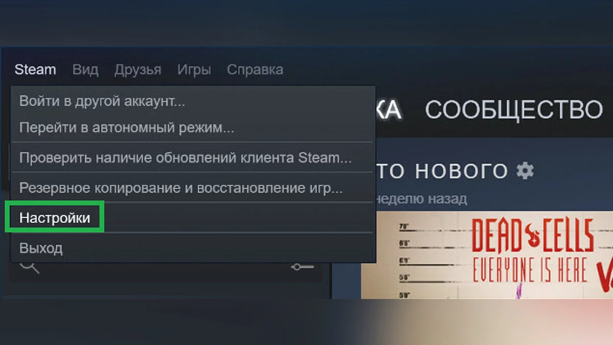 - Нажмите кнопку «Steam» в левом верхнем углу лаунчера, выберите пункт «Настройки».