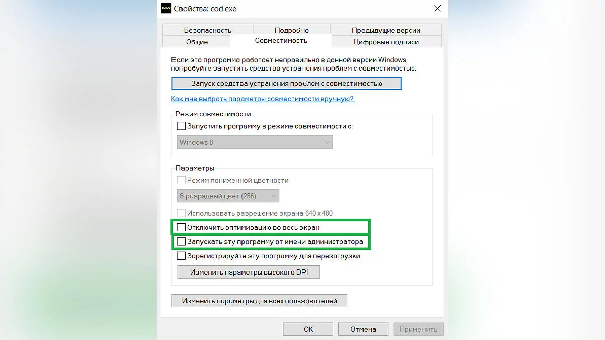 Отключение запуска от имени администратора и параметра «Отключить оптимизацию во весь экран» у cod.exe