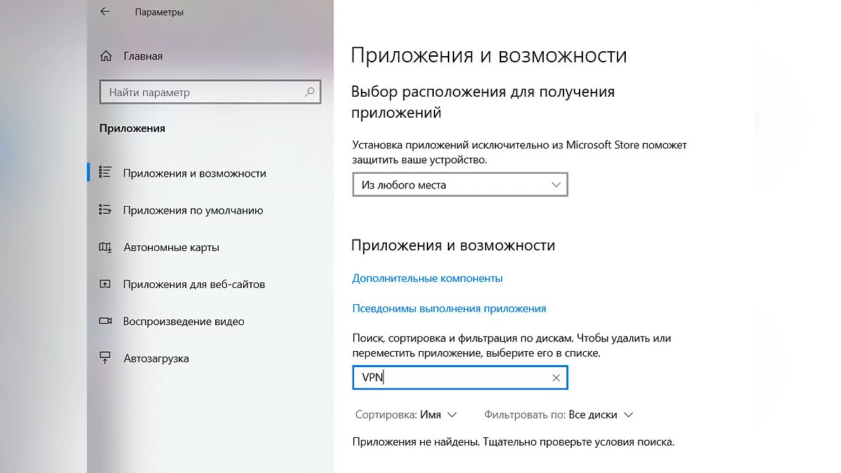 - Удалите все VPN-сервисы, при необходимости воспользовавшись поиском.
