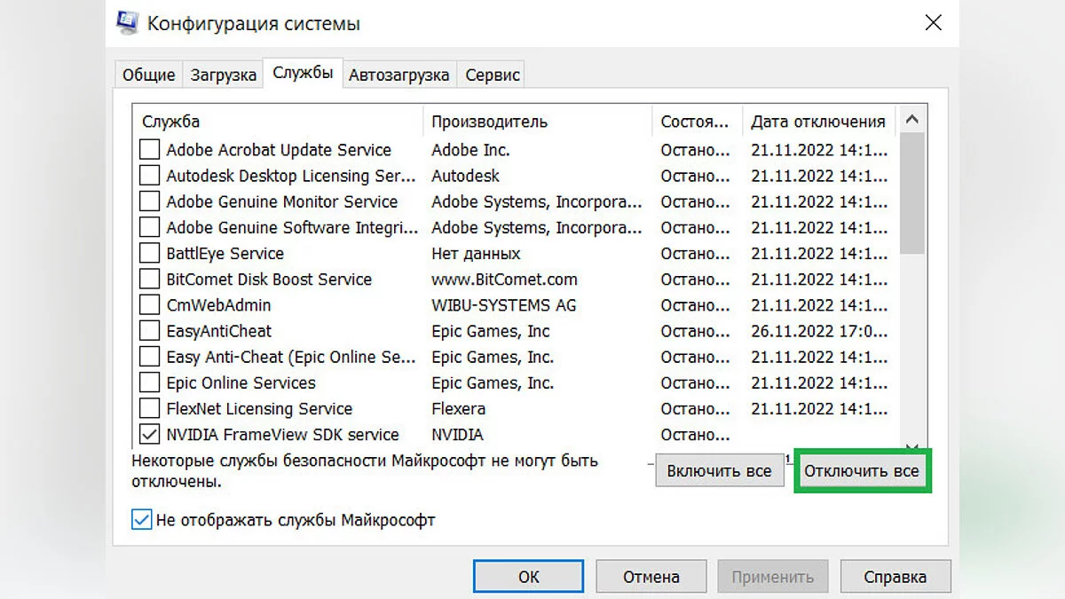 Одна из вероятных причин ошибки — наличие службы, которая мешает правильному запуску проекта. Для решения необходимо отключить все не системные службы. Делается это следующим образом.