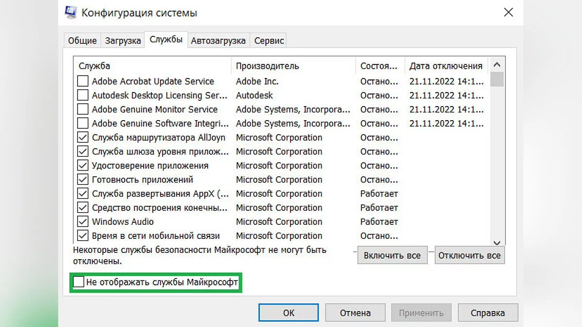 - Поставьте галочку внизу, напротив пункта «Не отображать службы Майкрософт».