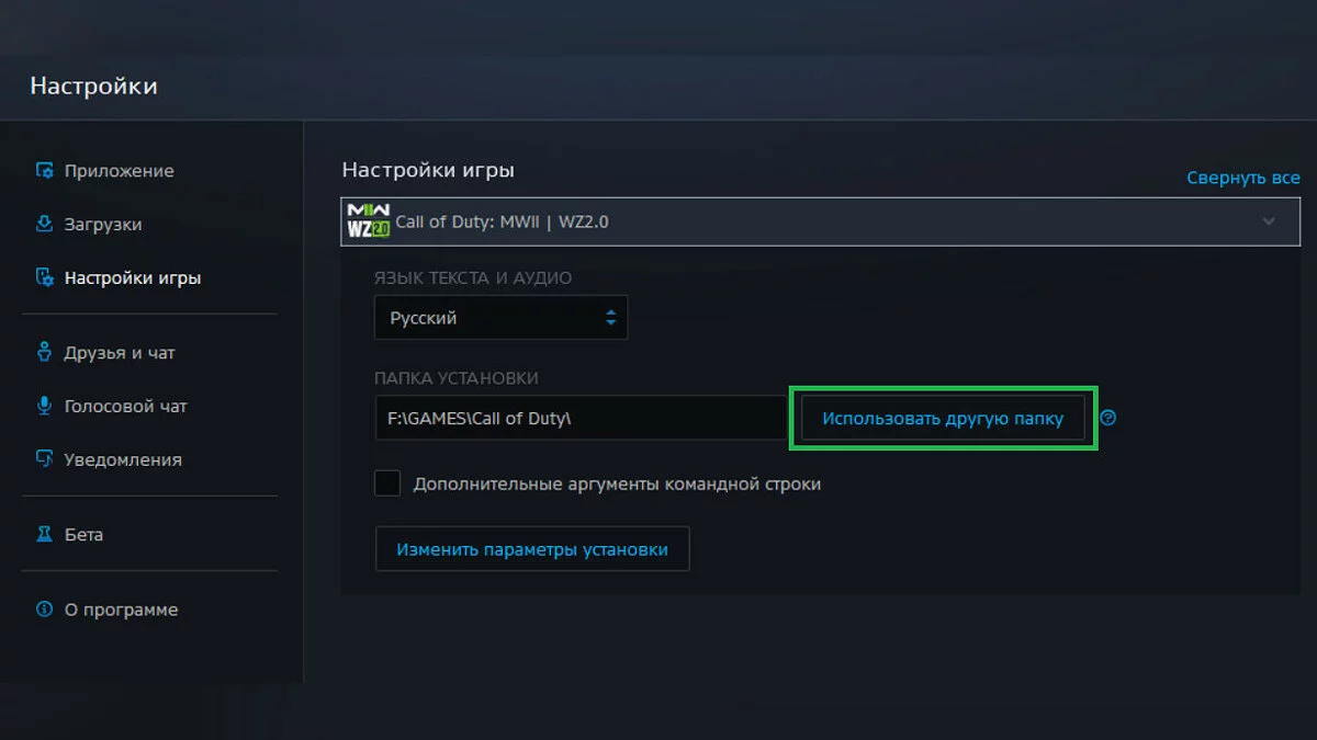 - Найдите пункт «Папки установки» и, нажав на кнопку «Использовать другую папку», укажите новое местоположение игры.