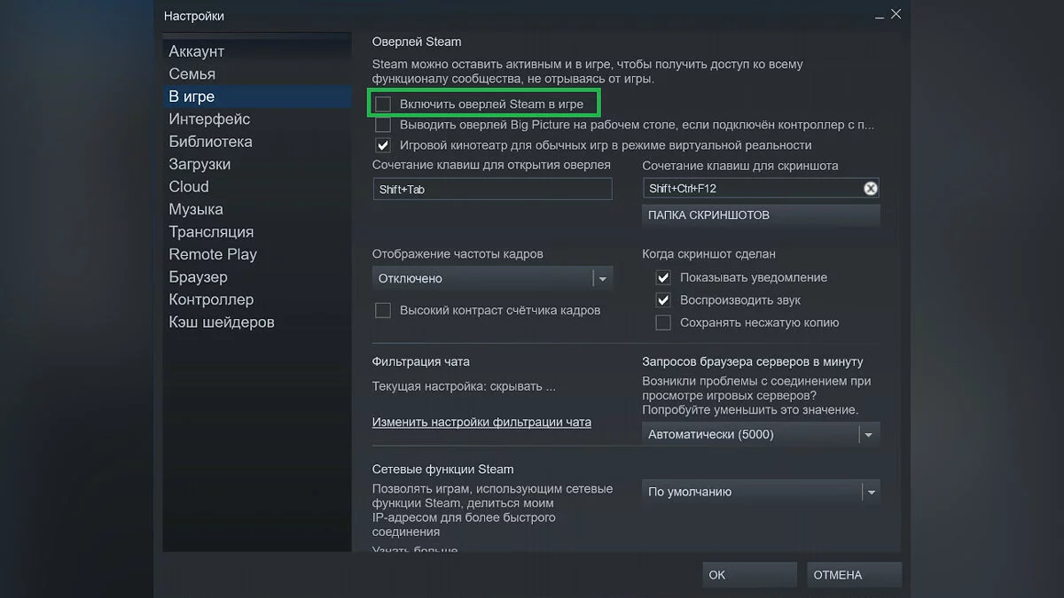 - Снимите галочку с пункта «Включить оверлей Steam в игре».