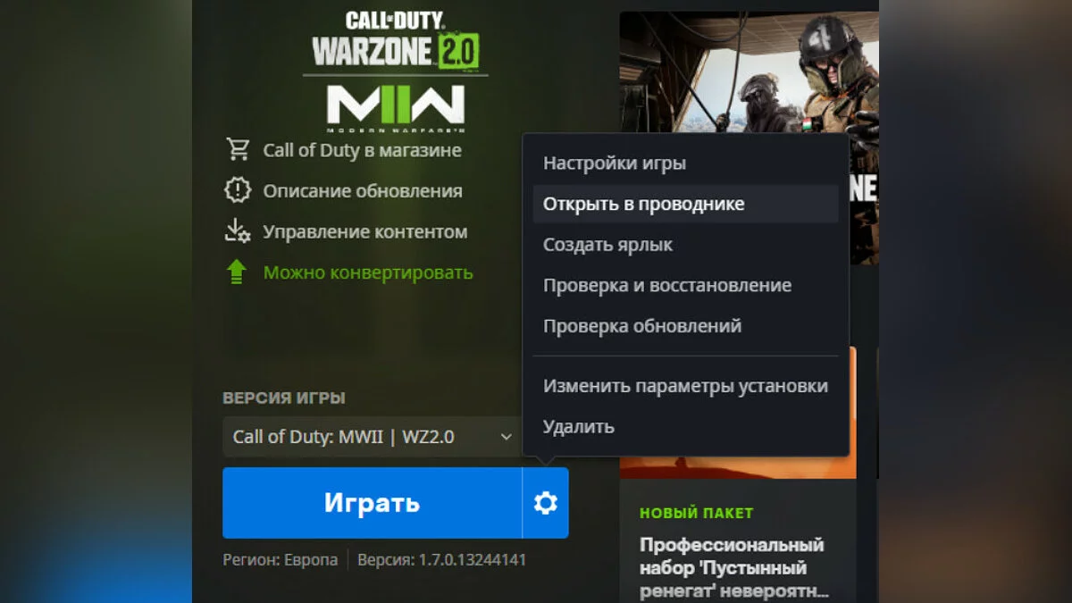 - Нажмите на шестеренку рядом с кнопкой «Играть», выберите пункт «Открыть в проводнике».