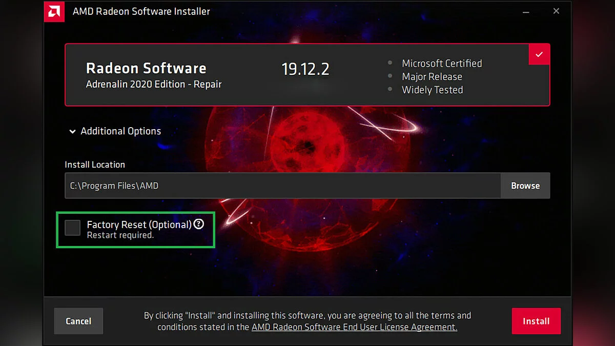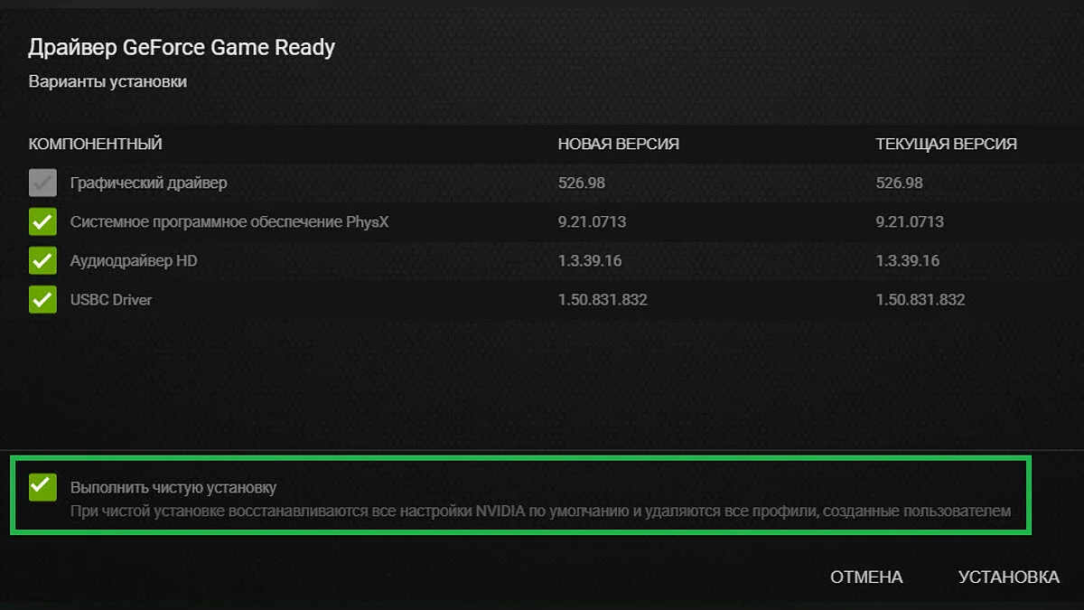 Иногда драйвера видеокарты неправильно обновляются, устанавливаясь поверх старой версии. В таком случае необходимо выполнять их «чистую» установку. Для этого скачайте пакет драйверов с официального сайта Nvidia или AMD, запустите программу и, выбрав вариант «Выполнить чистую установку» (Nvidia) или «Сброс к заводским настройкам» (AMD), переустановите драйвера.