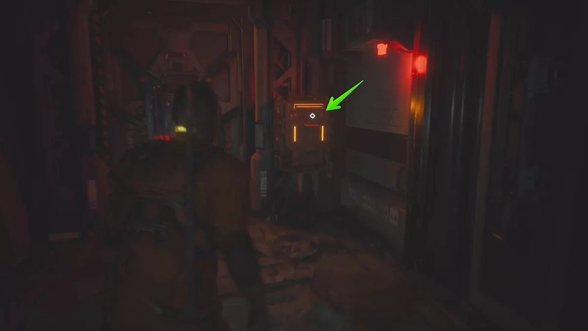 Пройдите по коридору и подберите преобразователь энергии. Подобные предметы в последующем можно обменивать на кредиты в специальном автомате. Попытайтесь открыть дверь в тупике. Можете осмотреть несколько камер, чтобы найти кредиты. Иногда они будут находиться в оранжевых ящиках с синими вставками.