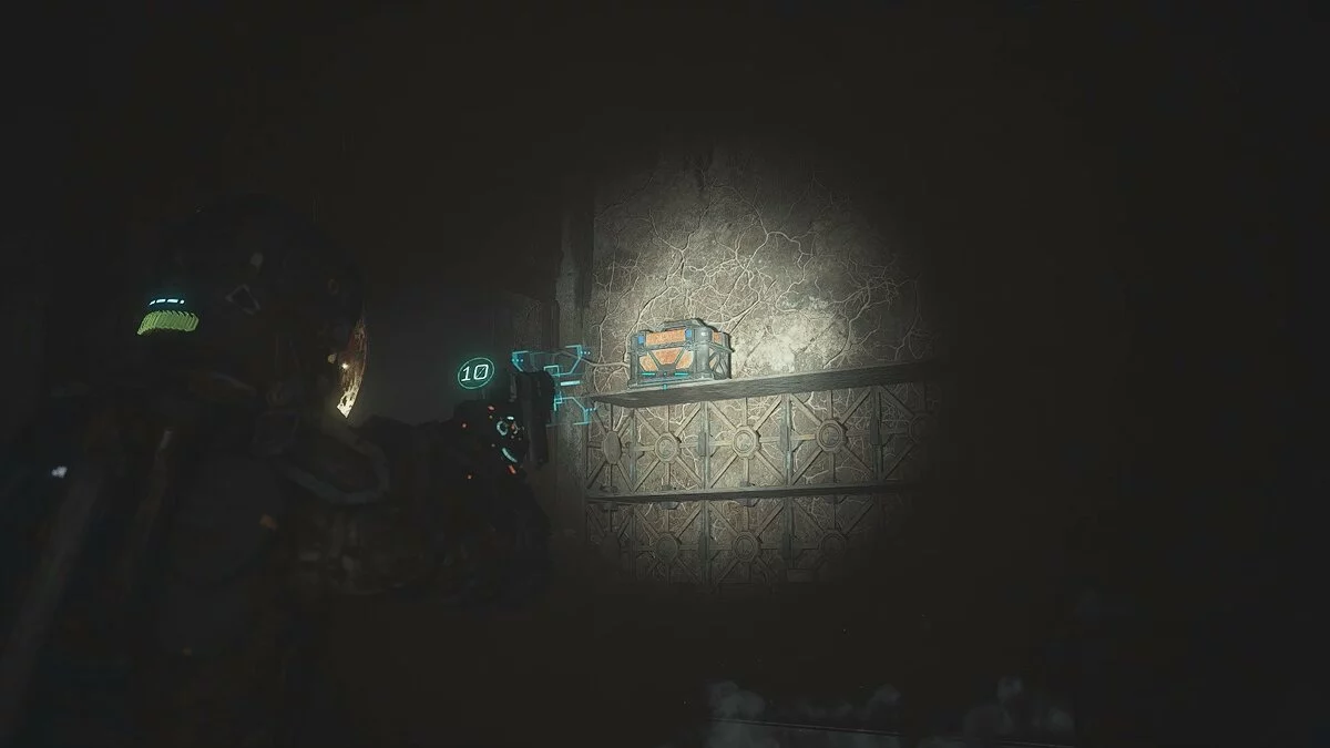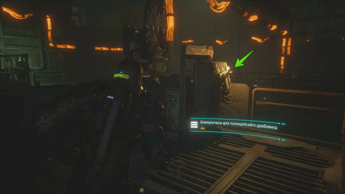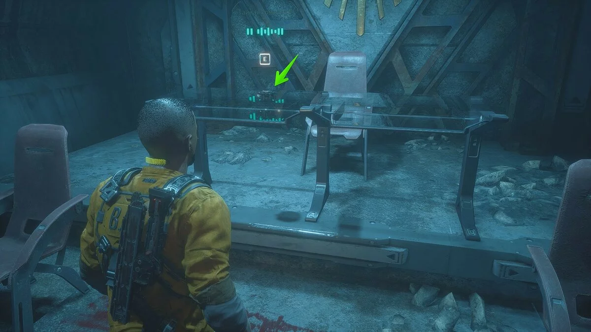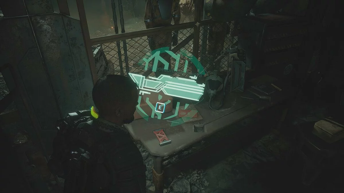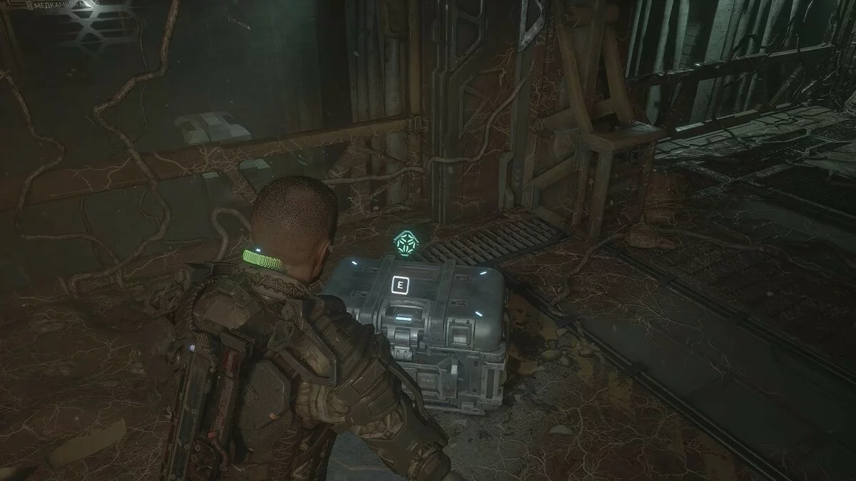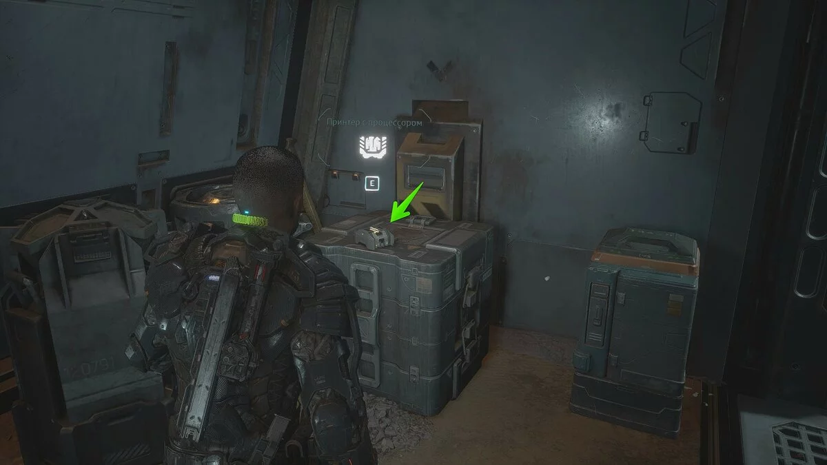 Элиас даст вам часть пистолета. Используйте специальное устройство, чтобы напечатать дополнительные детали для оружия. Осмотрите ящик в правой части комнаты. Внутри есть кредиты, патроны, восстанавливающая инъекция и преобразователь энергии.