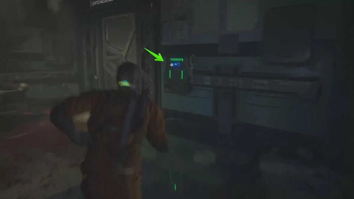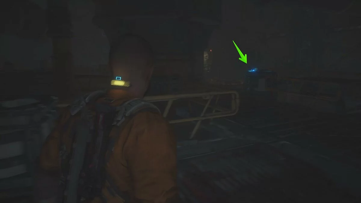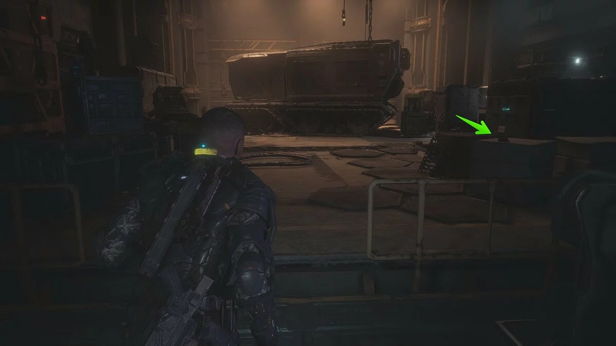Войдите в центральную дверь, которая ведёт в грузовой отсек, и спуститесь по лестнице вниз. Переберитесь через ящики и войдите ещё в одну дверь. Сразу за ней главный герой осмотрит медицинский груз.