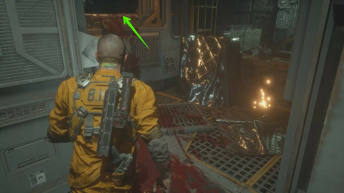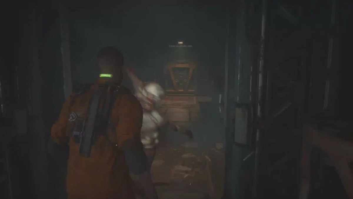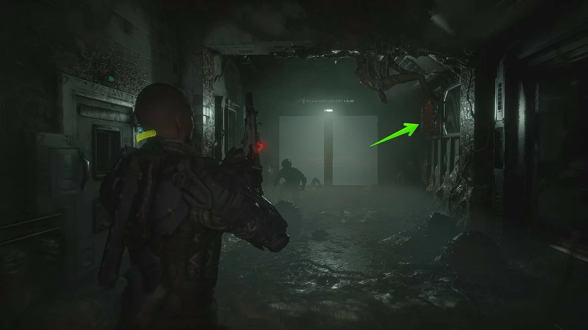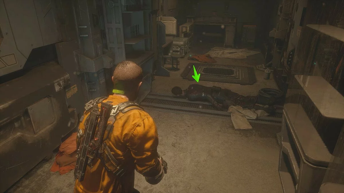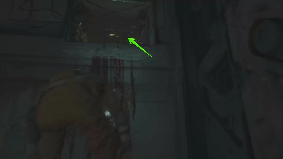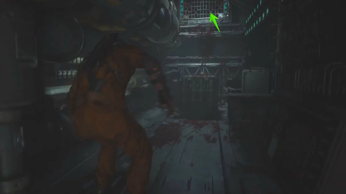 Рядом с вентилятором вы можете заметить паразита. Если не хотите, чтобы он вцепился в героя, выстрелите по нему несколько раз. В дальней части комнаты на вас также нападёт монстр. Неподалёку от места, где он появится, лежит труп офицера. Осмотрите его и заберите личное дело (6/7). Рядом с вентилятором есть ящик с припасами.