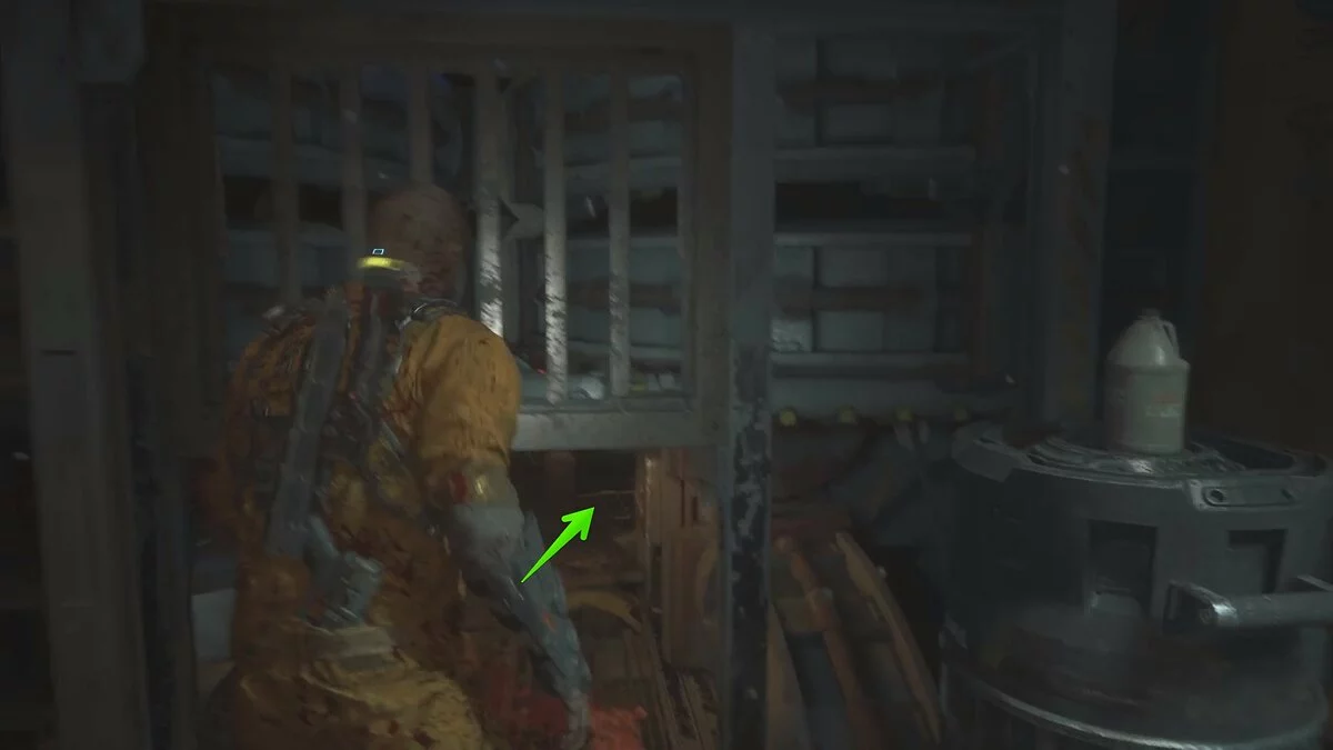 На полу рядом с запертой решёткой подберите предохранитель. Вы можете сразу вставить его в устройство рядом с дверью, либо вернуться обратно и найти чертёж дробовика в хранилище.