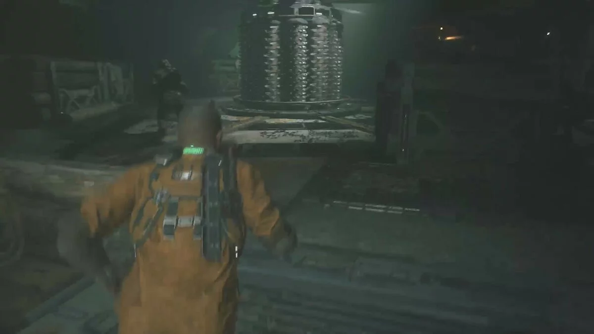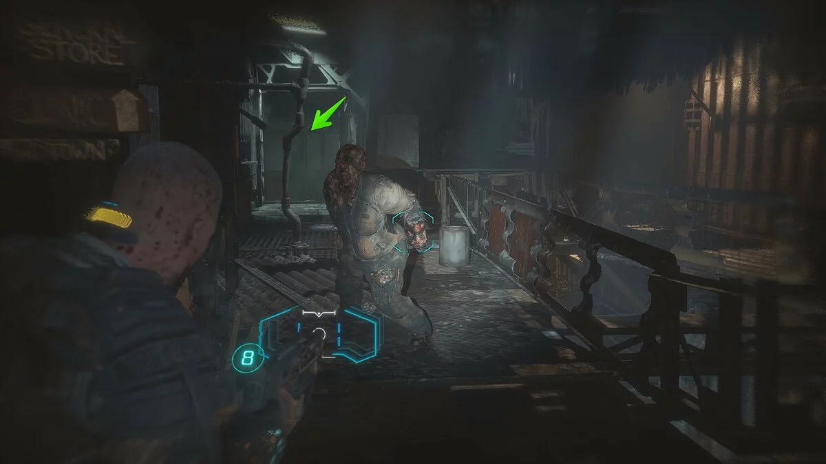 Встаньте на платформу и приготовьте свой пистолет. Когда ворота в противоположной части откроются, появятся два сильных и один обычный заражённый. Не стоит тратить на них патроны — используйте перчатку, чтобы скинуть их с платформы.