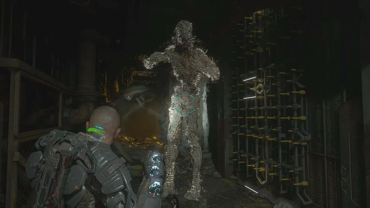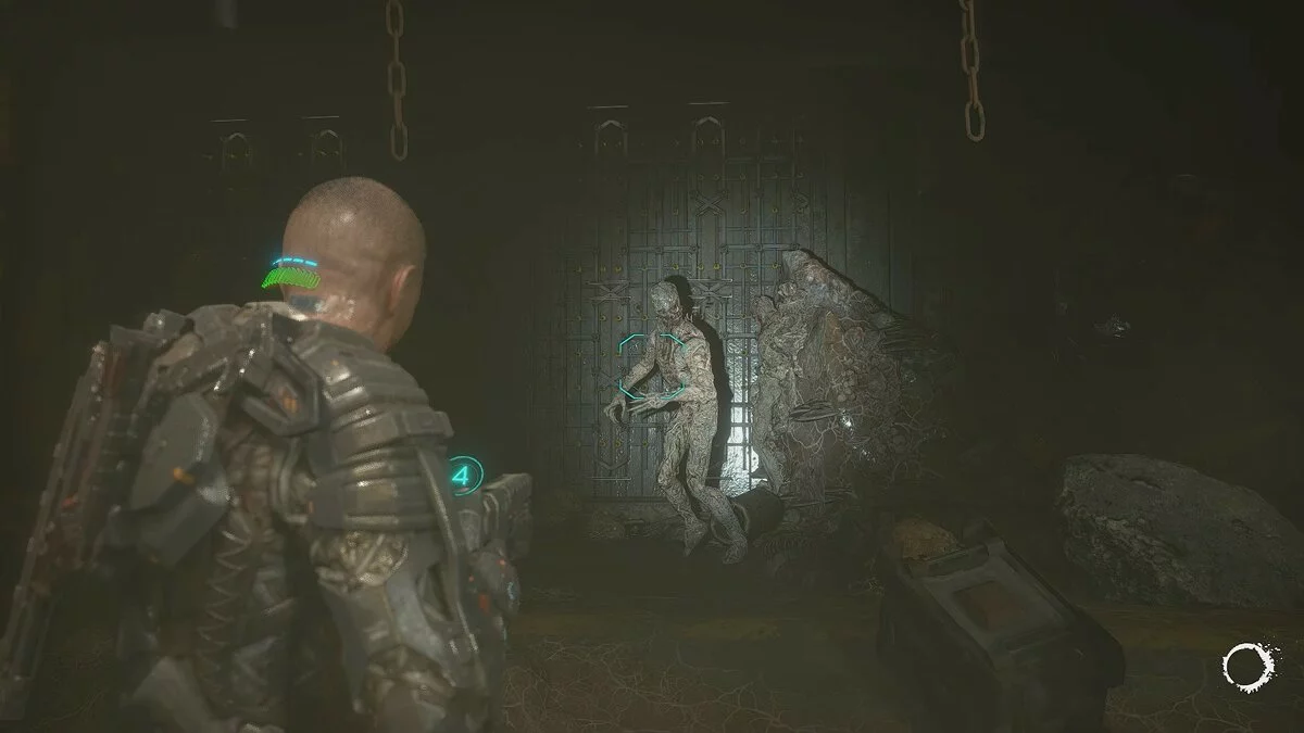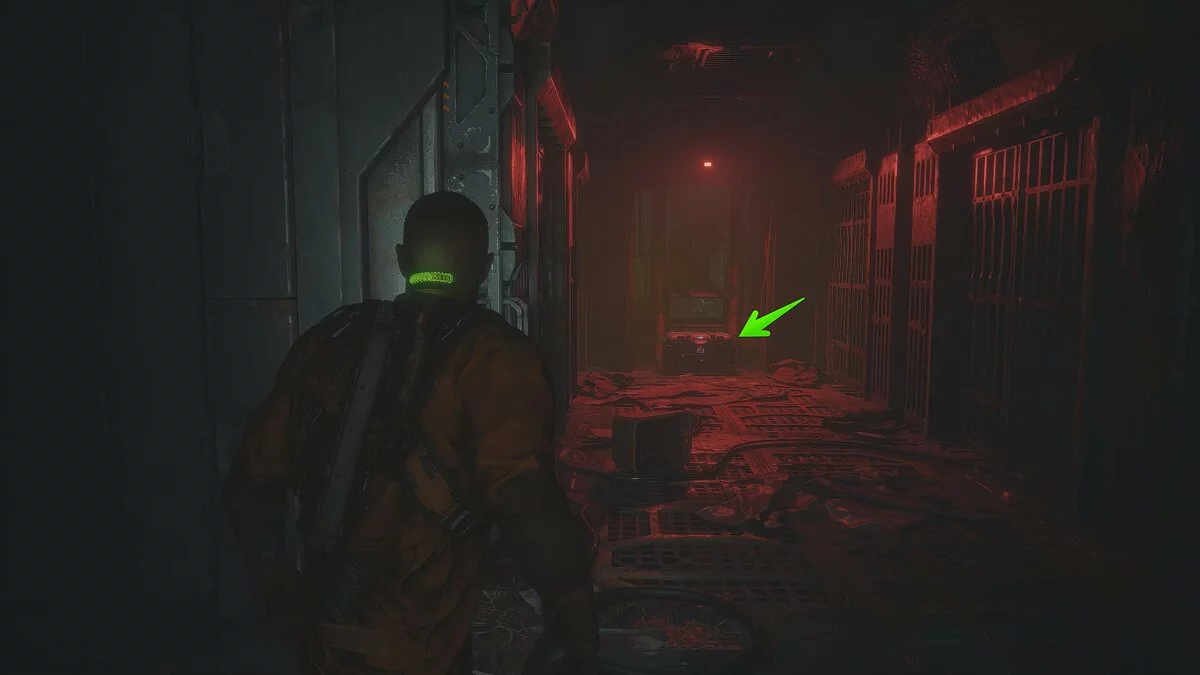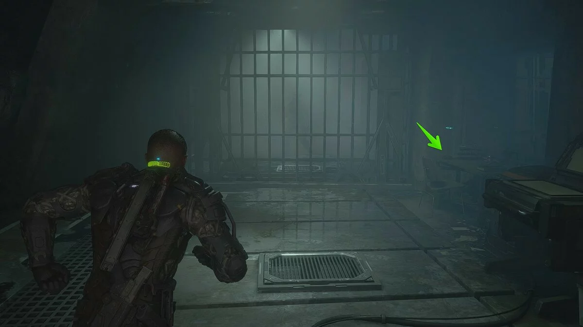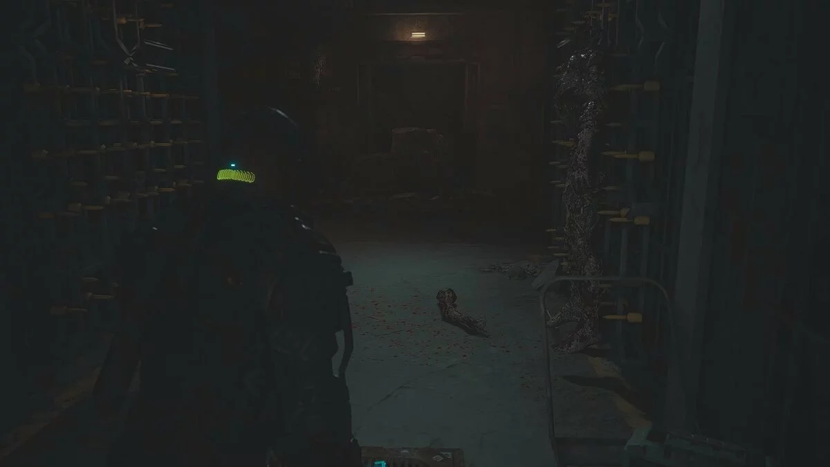Взаимодействуйте с пультом управления. В этот же момент на вас нападёт монстр. Выходите через дверь и спуститесь вниз. Так вы попадёте к камерам заключённых. У первой камеры слева можете забрать инъектор на стене. Подготовьтесь к сражению с несколькими врагами.
