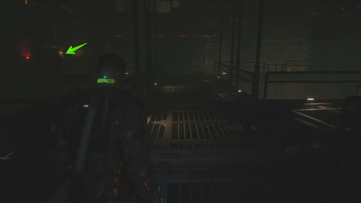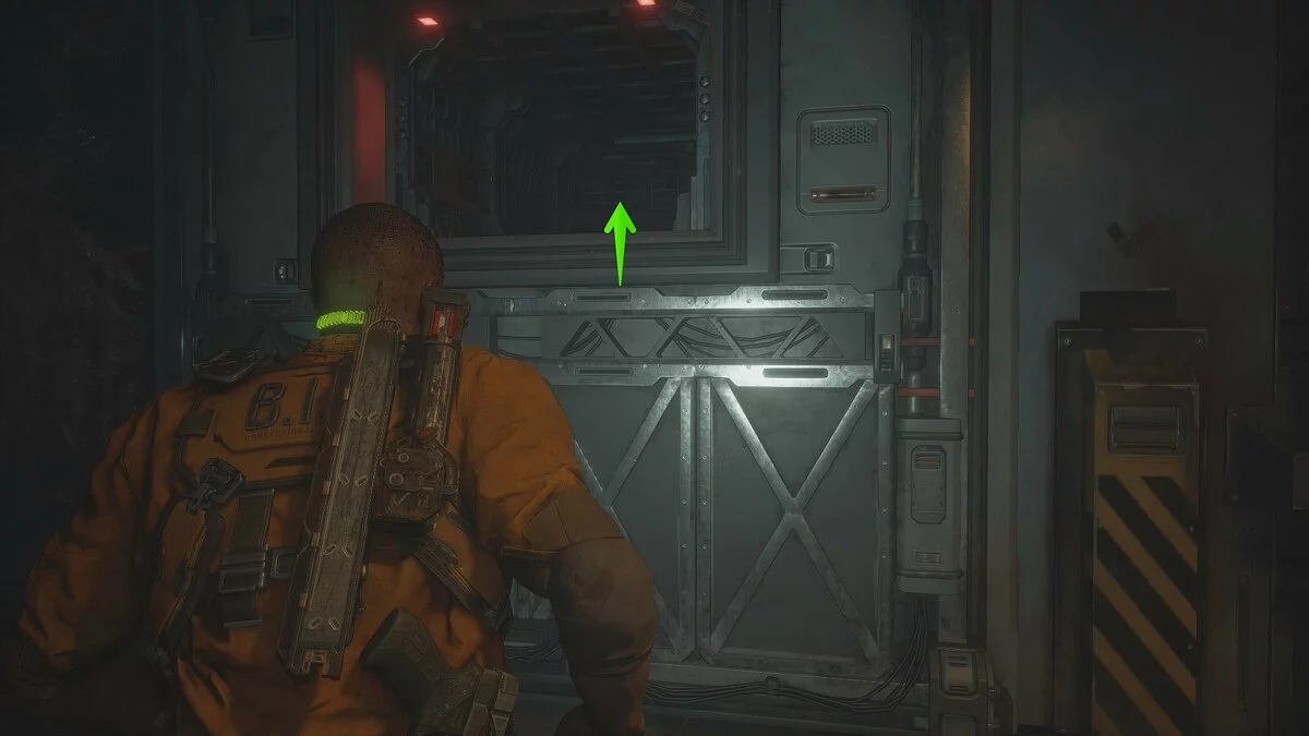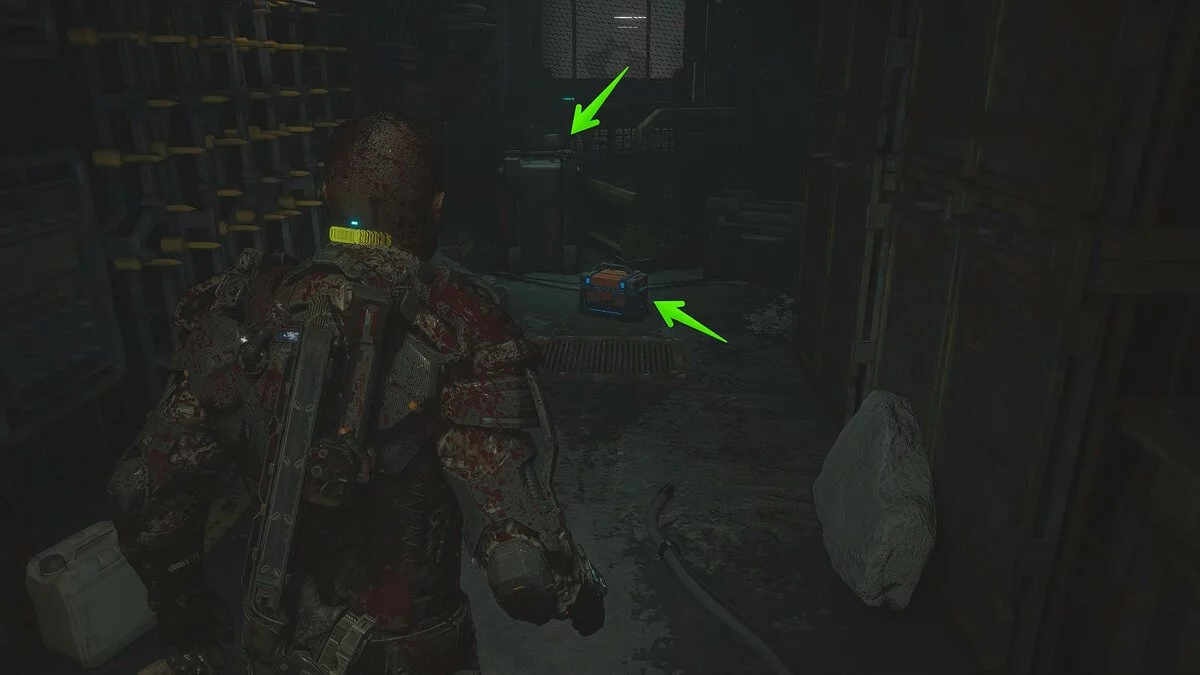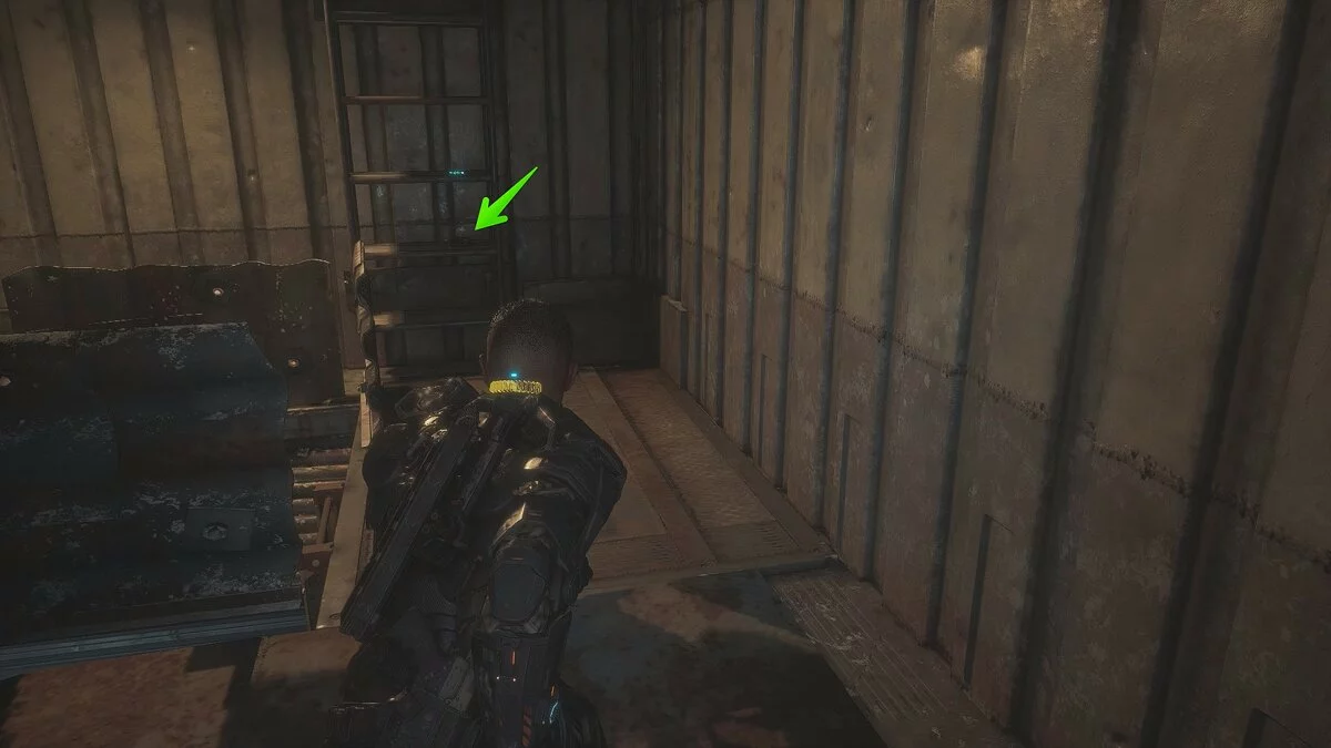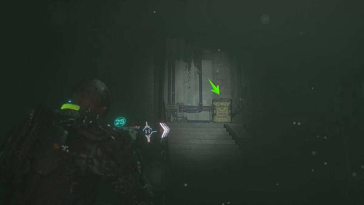 Заберите два предохранителя и инъектор рядом с запертой дверью. Вернитесь назад и посмотрите направо. Здесь есть несколько ящиков, по которым можно забраться на платформу выше.