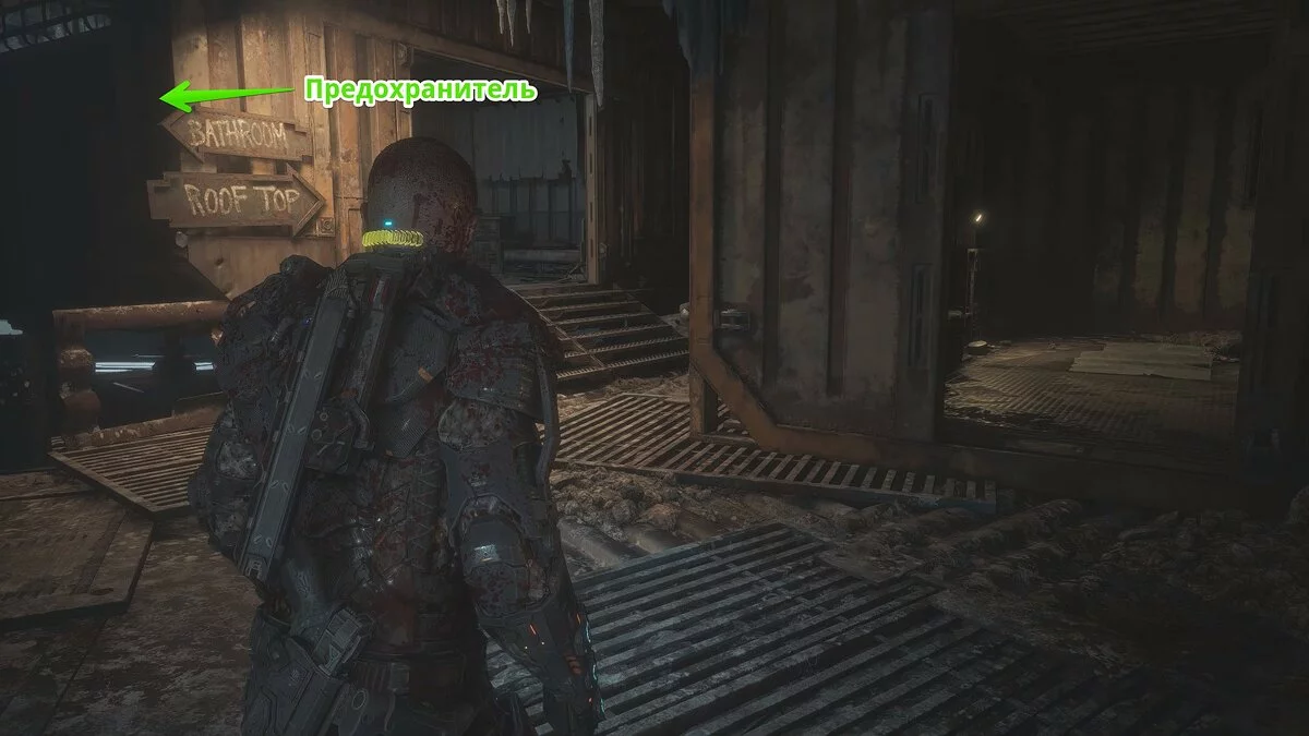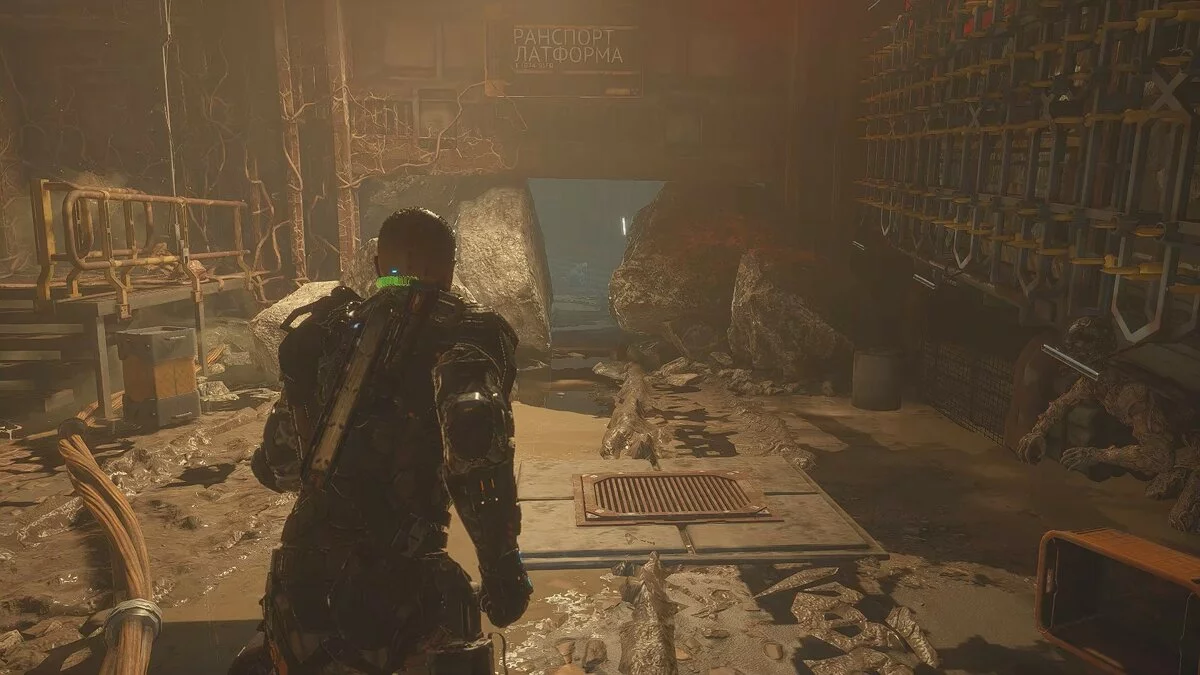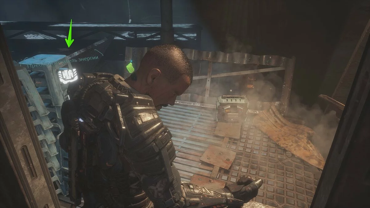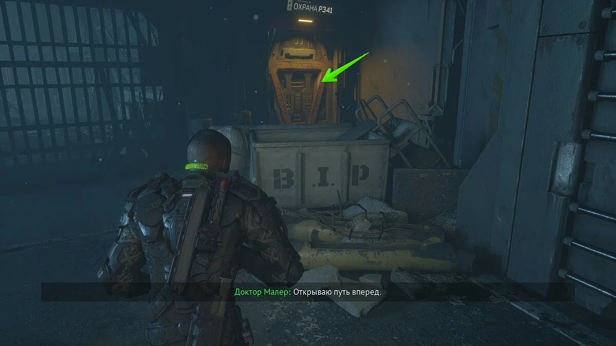 После непродолжительной беседы Элиас предложит восстановить питание. Спуститесь по лестнице вниз и подождите, пока приятель не откроет проход к лифту. Слева от него, к слову, есть устройство для улучшения оружия.