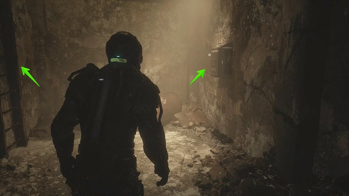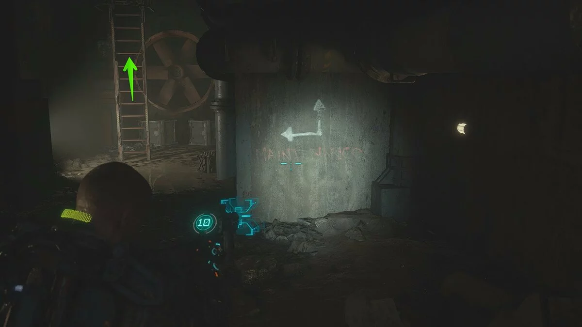 Отыщите шахту лифта и спуститесь по лестнице вниз. Здесь снова нужно отыскать предохранитель. Бегите налево и осмотрите решётку на вентиляции. Разбейте её при помощи перчатки.