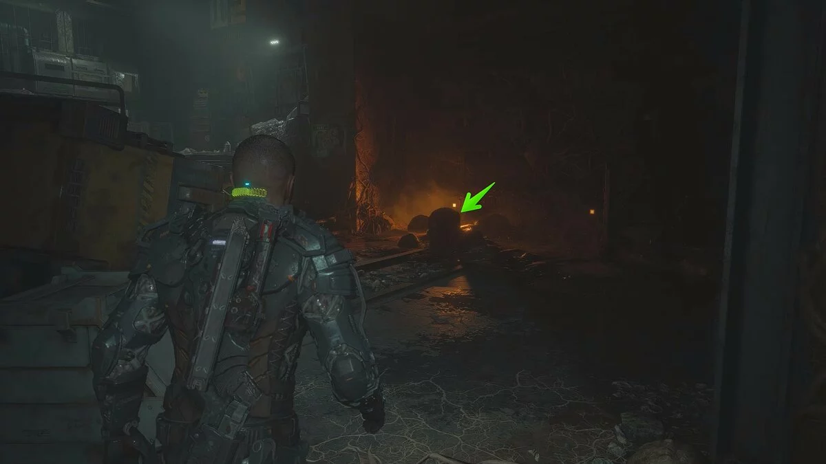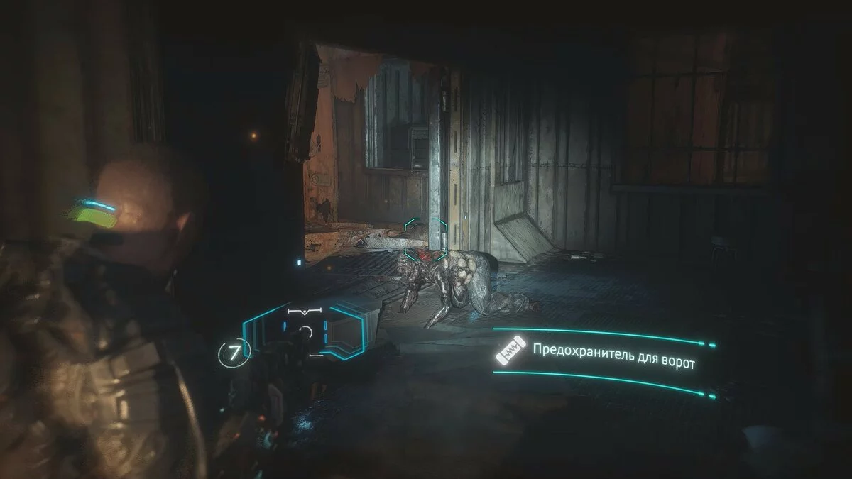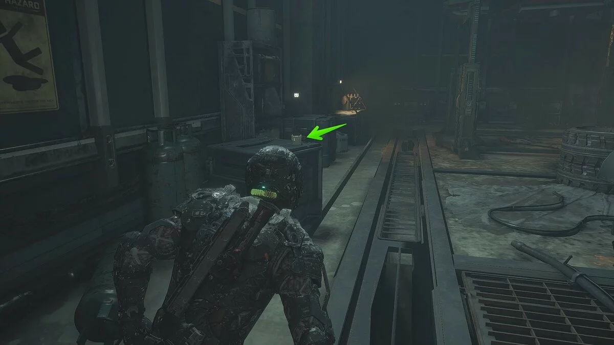 Сперва нужно осмотреть левую часть локации и отыскать предохранитель. Он лежит на столе во втором контейнере слева от входа. Как только вы его подберёте, развернитесь и убейте монстра, который забежал в помещение.