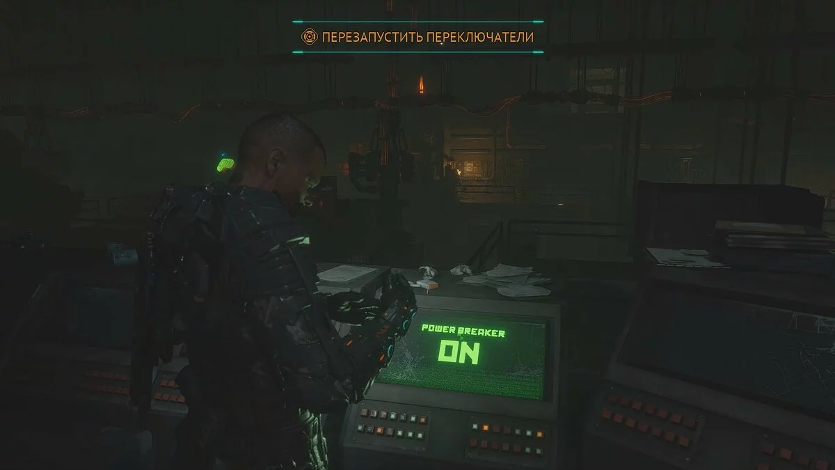 Подойдите к двери, у которой вы подобрали два предохранителя, и приготовьтесь убить ещё одну тварь. Поднимитесь по лестнице и взаимодействуйте с пультом управления. Задание обновится.