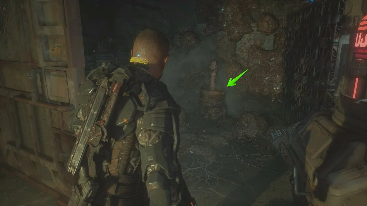 Войдите в единственную дверь и осмотрите небольшую комнату с автоматом для улучшения оружия. Сразу за дверью вас ждёт паразит.