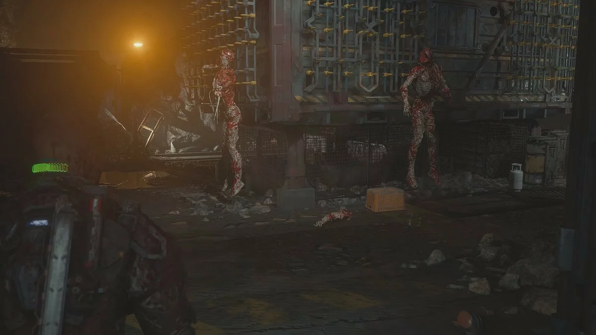 В клетках вы увидите нескольких монстров — не стоит тратить на них боеприпасы. Пройдите ещё немного вперёд, чтобы встретиться с заражённым. Здесь же вы заметите две гермодвери.