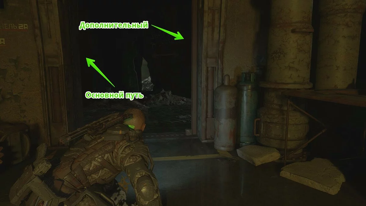 Войдите в дверь слева, спуститесь вниз и найдите ещё одну дверь. Пока что не заходите внутрь, а пройдите в следующий коридор. Справа есть дверь, которую можно открыть при помощи заточки. Также сюда можно попасть через вентиляцию слева — выберите удобный для вас способ.