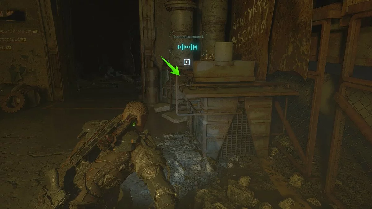 Пройдите немного вперёд. У поворота вы увидите труп — заберите аудиозапись (1/7) «Дневник шахтёра 1» и личное дело Алекса Ванга.