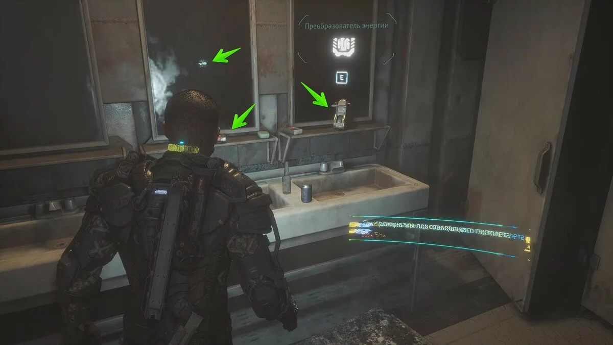 В уборной перед зеркалом найдите преобразователь энергии и чертёж штурмовой винтовки. В этом же помещении появится заражённый.