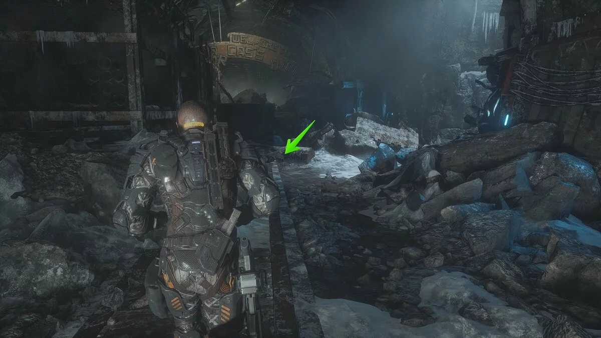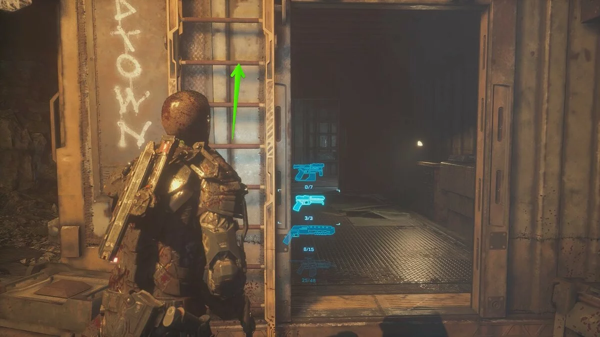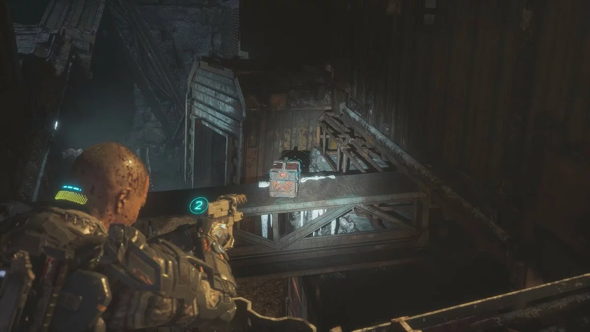 Спрыгивайте вниз, к поселению. Здесь будет много монстров, при чём они станут появляться время от времени. Будьте на чеку и осмотрите контейнеры на нижнем уровне вокруг лифта. Также осматривайте различные трубы, балки и стеллажи, на которых могут находиться контейнеры с припасами.