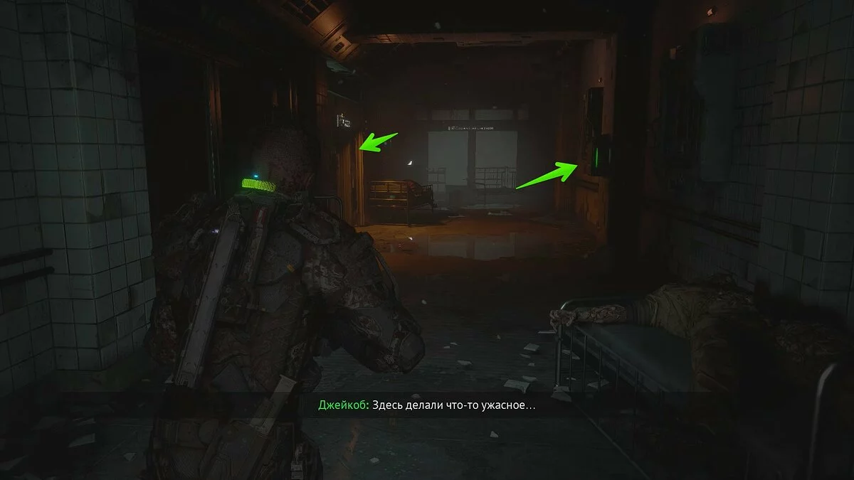 Дальше можете осмотреть шкафчики. В центральном прячется паразит. Пройдите через психиатрический блок, отбиваясь от врагов, затем спуститесь по лестнице вниз. Напротив входа в морг можете подобрать инъектор на стене.