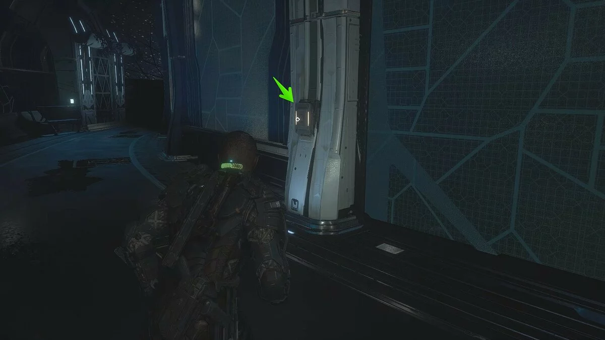 В конце прохода справа есть лифт. Взаимодействуйте с консолью синего цвета.