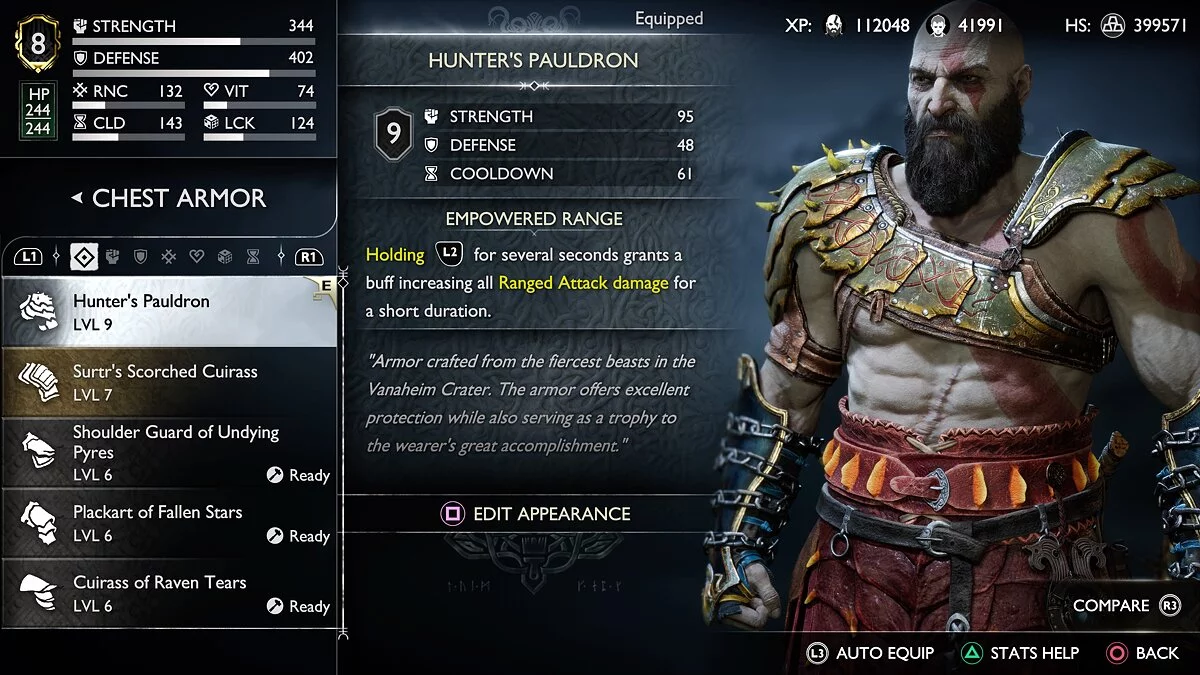 Получив необходимые ресурсы, можно создать сет Брони Охотника в лавке гномов. Доспехи увеличивают силу Кратоса, снижают время кулдауна способностей и дают бонусы к дальнобойным атакам.