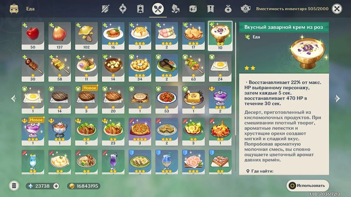 Заварной крем из роз. Восстанавливает от 18 до 22% здоровья активного персонажа сразу, а затем восполняет 300-470 единиц жизненной силы каждые 5 секунд на протяжении 30 секунд. Эффективность блюда зависит от его качества. Чтобы оно получилось идеальным, нужно выиграть в мини-игре — остановить стрелку в отмеченной указанной зоне. Подобная механика работает и с другими разновидностями еды, которые будут упомянуты в данном руководстве.