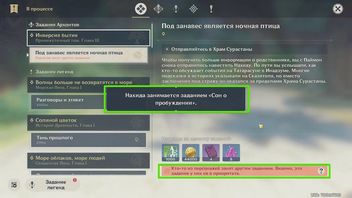 Примечание: если вы открыли задание легенд Нахиды «Госпожа мудрости. Глава 1» и не выполнили первый квест «Сон о пробуждении», то не сможете продолжить прохождение данного задания. Вернитесь к выполнению квеста Нахиды.
