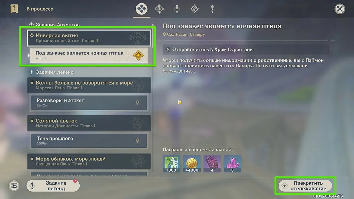 Если все задачи выполнены, откройте журнал задач и в разделе «Задания Архонтов» отыщите квест «Под занавес является ночная птица». Нажмите «Отслеживать».