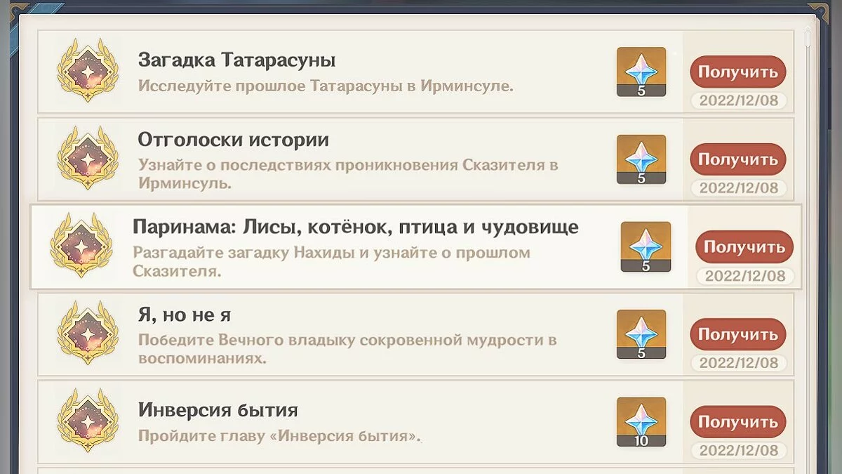 - Паринама: Лисы, котёнок, птица и чудовище — Разгадайте загадку Нахиды и узнайте о прошлом Сказителя.