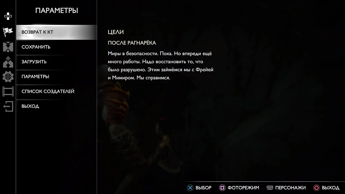Последний раздел — «Персонаж». Здесь можно скрыть самого бога войны, его спутников или иных персонажей. Также тут выбираются выражения лиц Кратоса и спутника. Далеко не всех героев получится «отредактировать». Пока доступны лишь основные: Кратос, Атрей, Фрейя, Брок, Синдри, Ангрбода, Тор и Труд. Изменить выражение у Мимира, к сожалению, нельзя. При этом «лиц» у Кратоса доступно аж 28, а у остальных — лишь по 10.