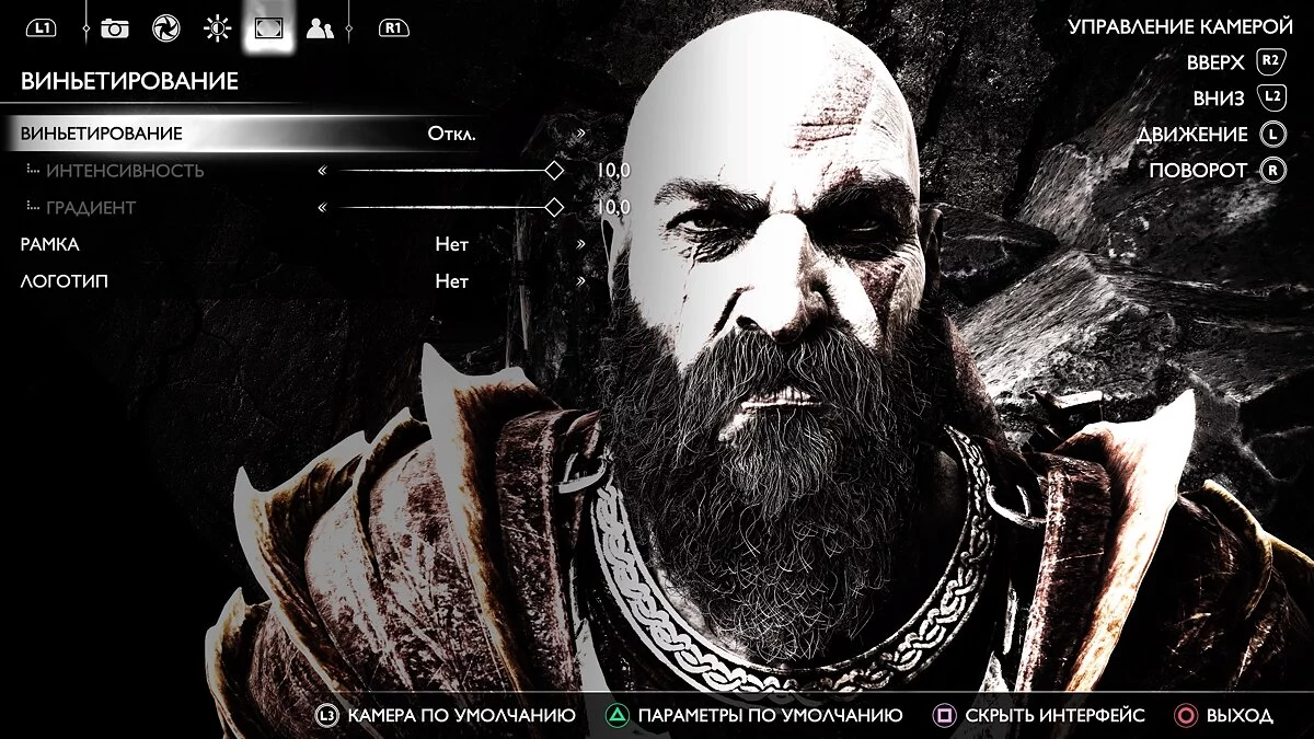 Следующий раздел — «Виньетирование». Здесь без сюрпризов — затемняем края. Единственно, что хочется отметить — возможность установить рамки и логотип игры. Так легко получится сделать фото Кратоса на паспорт.