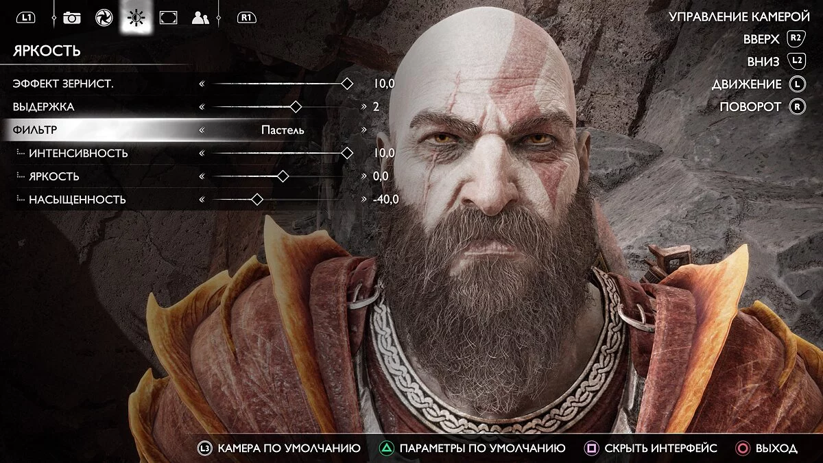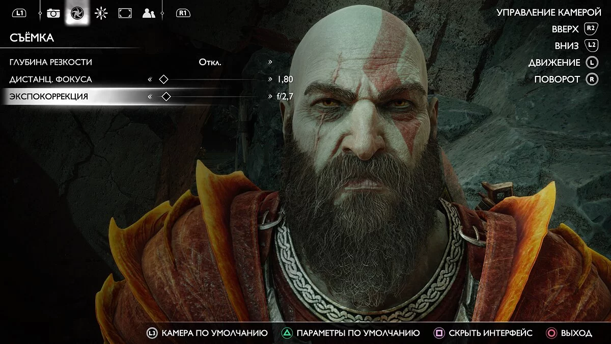 Открыв фоторежим, в первую очередь вы сможете двигать камерой. Левый стик отвечает за движение вправо-влево, ближе-дальше, правый стик позволяет поворачивать, а R2 и L2 — поднимать вверх и вниз. Обратите внимание, что камера привязана к Кратосу и не может «улететь» от него слишком далеко.
