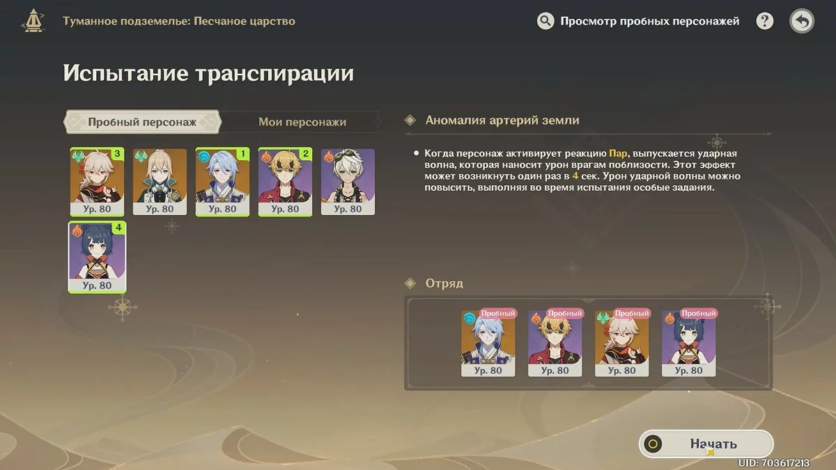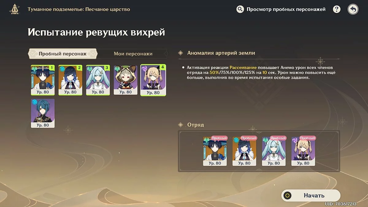 Вам будут доступны шесть пробных персонажей, двое из которых пятызвёздочные герои стихии Анемо. Мы рекомендуем взять только одного подобного персонажа, а также двух Пиро и одного Гидро героя.